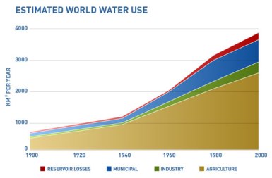 Graph: Estimated World Water Use - displays the estimated world water use in Reservoir losses, Municipal, Industry & Agriculture areas.