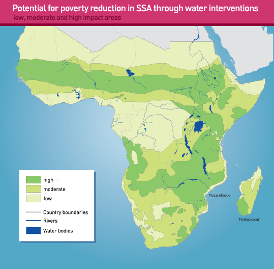Map:Potential for poverty reduction through water interventions in sub-Saharan Africa - represents the potential for poverty reduction through water-related interventions in different livelihood zones in sub-Saharan Africa.